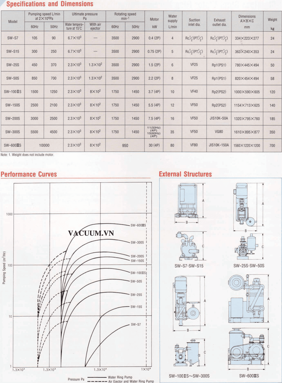 Bơm chân không vòng nước Shinko Seiki SW-100 II S sử dụng động cơ: 3.7 kW (4P), tốc độ vòng quay động cơ: 1.450 vòng/phút, size kết nối (vào/ra): VF40/PS2.