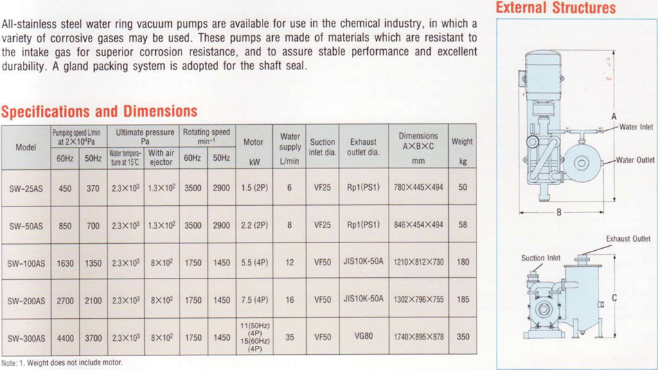 Bơm chân không vòng nước Shinko Seiki SW-300AS toàn thân bằng inox (Stainless steel), có kích thước: 1.740 x 895 x 878 mm, trọng lượng: 350 kg.