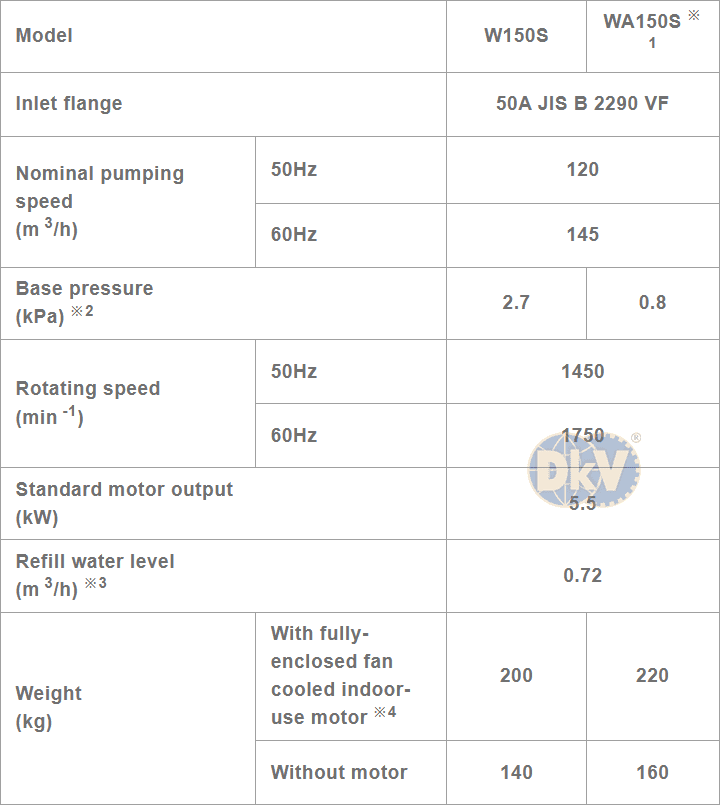 Bơm chân không vòng nước Osaka WA150S có độ ồn max: 67 dB(A). Cổ hút/cổ xả: JIS 50A | JIS 50A. Thân vỏ bằng gang đúc, Cánh gạt: gang cầu, Trục bơm: thép không gỉ 420S37, vòng đệm làm kín: kiểu phớt cơ khí.