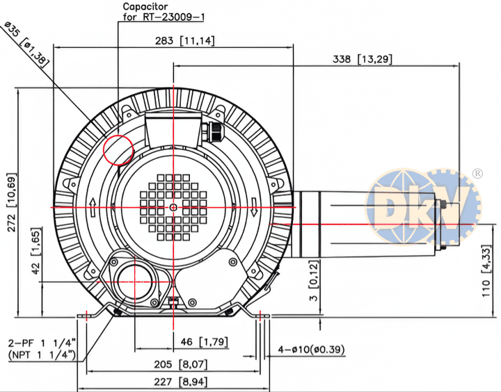 Cổ hút và cổ xả của máy thổi khí con sò Hae Sung HB II-2308S đều có ren size tiêu chuẩn NPT1-1/4", thuận tiện khi kết nối với đường ống hoặc các phụ kiện (lọc gió đầu vào, ống giảm thanh, valve chỉnh áp....). Dưới đáy chân đế của máy thổi khí con sò Hae Sung HB II-2308S có 4 lỗ khoan Ø 10 mm, thuận tiện khi gá đặt.
