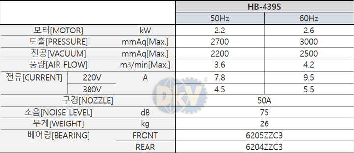 Máy thổi khí con sò Hae Sung HB-439S, Hae Sung ring blower HB-439S, Hae Sung slide channel blower HB-439S: có hình dạng con sò, thuộc loại 1 cấp - 1 satge (1 tầng) do Hae Sung | Korea sản xuất. Máy thổi khí con sò Hae Sung HB-439S có lưu lượng max: 3.6 (m3/phút) | 216 m3/giờ, áp thổi max: 2.700 mmAq (270 mbar) | cột áp 2.7 mét, độ chân không: - 2.200 mmAq (-220 mbar), chuyên dùng để hút/thổi khí trong dân dụng và công nghiệp.