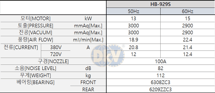 Máy thổi khí con sò Hae Sung HB-929S, Hae Sung ring blower HB-929S, Hae Sung slide channel blower HB-929S: có hình dạng con sò, thuộc loại 1 cấp - 1 satge (1 tầng) do Hae Sung | Korea sản xuất. Máy thổi khí con sò Hae Sung HB-929S có lưu lượng max: 18.9 (m3/phút) | 1.134 m3/giờ, áp thổi max: 3.000 mmAq (300 mbar) | cột áp 3 mét, độ chân không: - 3.000 mmAq (-300 mbar), chuyên dùng để hút/thổi khí trong dân dụng và công nghiệp.