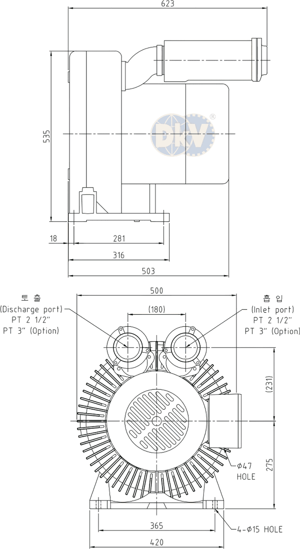 Cổ hút và cổ xả của máy thổi khí con sò Hwanghae HRB-1000 đều có ren size tiêu chuẩn PT 2-1/2", thuận tiện khi kết nối với đường ống hoặc các phụ kiện (lọc gió đầu vào, ống giảm thanh, valve chỉnh áp....). Dưới đáy chân đế của máy thổi khí con sò Hwanghae HRB-1000 có 4 lỗ khoan Ø 15 mm, thuận tiện khi gá đặt.