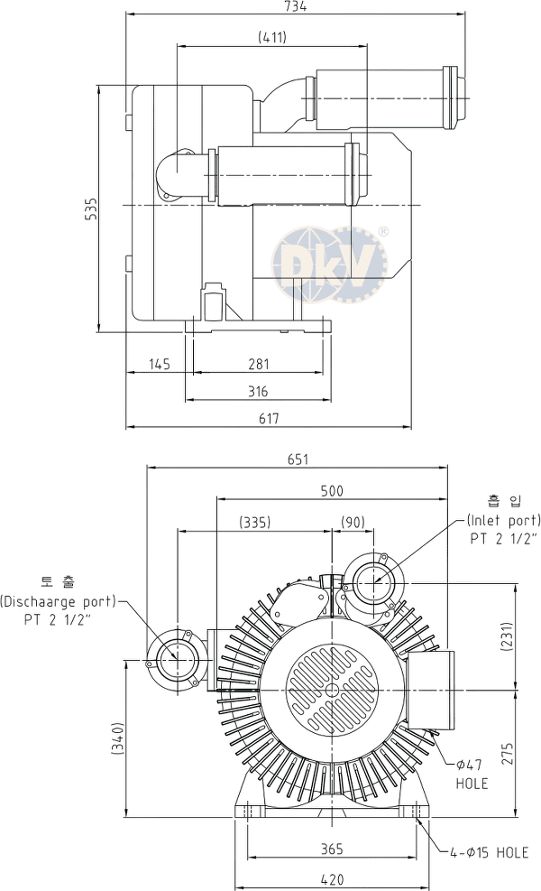 Cổ hút và cổ xả của máy thổi khí con sò Hwanghae HRB-1102 đều có ren size tiêu chuẩn PT 2-1/2", thuận tiện khi kết nối với đường ống hoặc các phụ kiện (lọc gió đầu vào, ống giảm thanh, valve chỉnh áp....). Dưới đáy chân đế của máy thổi khí con sò Hwanghae HRB-1102 có 4 lỗ khoan Ø 15 mm, thuận tiện khi gá đặt.