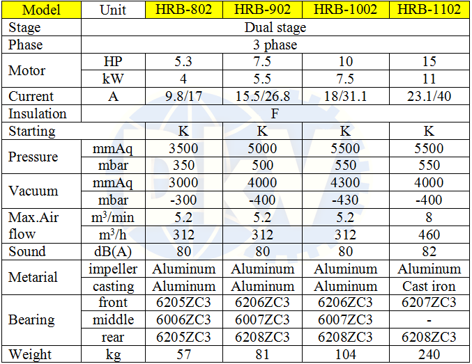 Máy thổi khí con sò Hwanghae HRB-1102, sử dụng động cơ 15 HP/220 - 380V/50Hz/3ph, quấn dây đồng 100%, độ ồn max: 82 dB(A), sẽ giảm tiếng ồn khi lắp thêm ống giảm thanh tại cổ xả khí. Phân cánh quạt và thân vỏ được chế tạo bằng nhôm, giúp nhẹ và thoát nhiệt tốt.