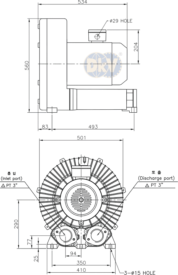 Cổ hút và cổ xả của máy thổi khí con sò Hwanghae HRB-1110 đều có ren size tiêu chuẩn PT 3", thuận tiện khi kết nối với đường ống hoặc các phụ kiện (lọc gió đầu vào, ống giảm thanh, valve chỉnh áp....). Dưới đáy chân đế của máy thổi khí con sò Hwanghae HRB-1110 có 4 lỗ khoan Ø 15 mm, thuận tiện khi gá đặt.