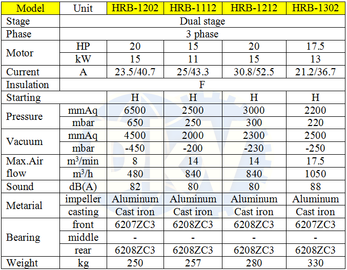 Máy thổi khí con sò Hwanghae HRB-1302, sử dụng động cơ 17.5 HP/220 - 380V/50Hz/3ph, quấn dây đồng 100%, độ ồn max: 88 dB(A), sẽ giảm tiếng ồn khi lắp thêm ống giảm thanh tại cổ xả khí. Phân cánh quạt và thân vỏ được chế tạo bằng nhôm, giúp nhẹ và thoát nhiệt tốt.