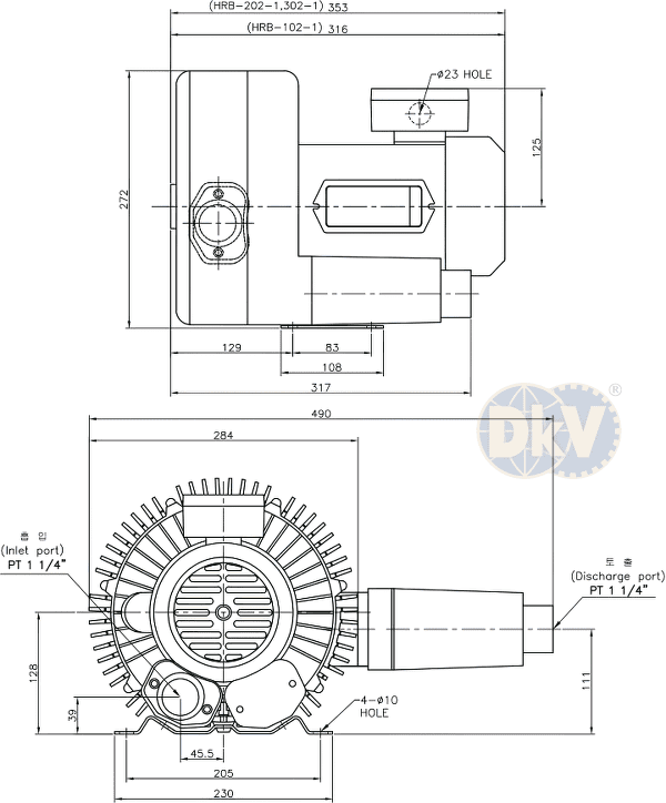 Cổ hút và cổ xả của máy thổi khí con sò Hwanghae HRB-202/1 đều có ren size tiêu chuẩn PT 1-1/4", thuận tiện khi kết nối với đường ống hoặc các phụ kiện (lọc gió đầu vào, ống giảm thanh, valve chỉnh áp....). Dưới đáy chân đế của máy thổi khí con sò Hwanghae HRB-202/1 có 4 lỗ khoan Ø 10 mm, thuận tiện khi gá đặt.