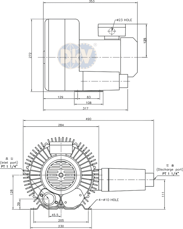 Cổ hút và cổ xả của máy thổi khí con sò Hwanghae HRB-302 đều có ren size tiêu chuẩn PT 1-1/4", thuận tiện khi kết nối với đường ống hoặc các phụ kiện (lọc gió đầu vào, ống giảm thanh, valve chỉnh áp....). Dưới đáy chân đế của máy thổi khí con sò Hwanghae HRB-302 có 4 lỗ khoan Ø 10 mm, thuận tiện khi gá đặt.