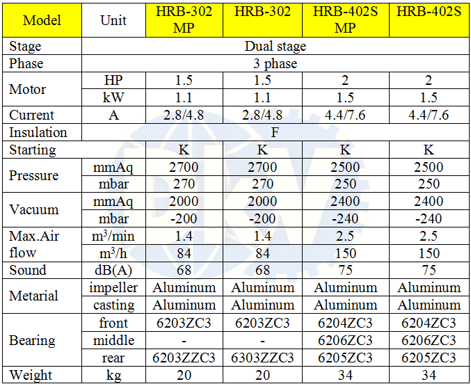 Máy thổi khí con sò Hwanghae HRB-302, sử dụng động cơ 1.5 HP/220 - 380V/50Hz/3ph, quấn dây đồng 100%, độ ồn max: 68 dB(A), sẽ giảm tiếng ồn khi lắp thêm ống giảm thanh tại cổ xả khí. Phân cánh quạt và thân vỏ được chế tạo bằng nhôm, giúp nhẹ và thoát nhiệt tốt.
