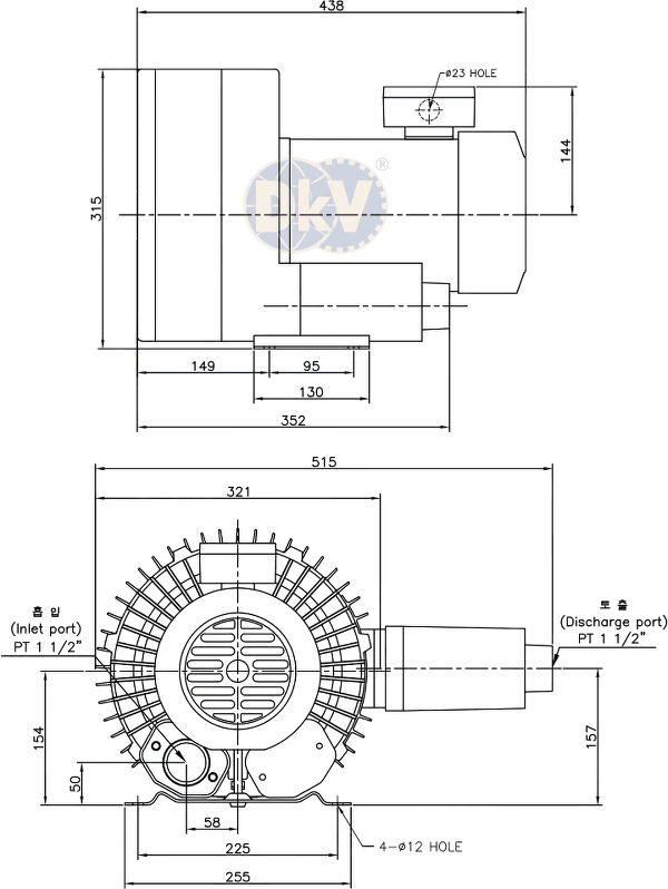 Cổ hút và cổ xả của máy thổi khí con sò Hwanghae HRB-402MP đều có ren size tiêu chuẩn PT 1-1/2", thuận tiện khi kết nối với đường ống hoặc các phụ kiện (lọc gió đầu vào, ống giảm thanh, valve chỉnh áp....). Dưới đáy chân đế của máy thổi khí con sò Hwanghae HRB-402MP có 4 lỗ khoan Ø 12 mm, thuận tiện khi gá đặt.