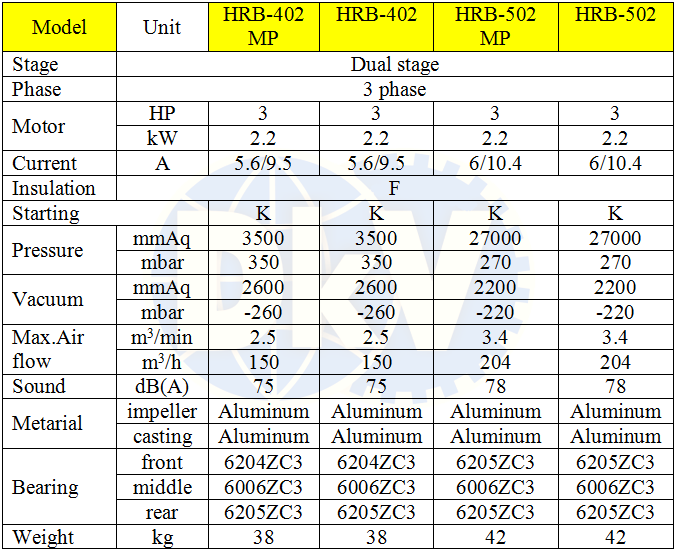Máy thổi khí con sò Hwanghae HRB-402MP, sử dụng động cơ 3 HP/220 - 380V/50Hz/3ph, quấn dây đồng 100%, độ ồn max: 75 dB(A), sẽ giảm tiếng ồn khi lắp thêm ống giảm thanh tại cổ xả khí. Phân cánh quạt và thân vỏ được chế tạo bằng nhôm, giúp nhẹ và thoát nhiệt tốt.