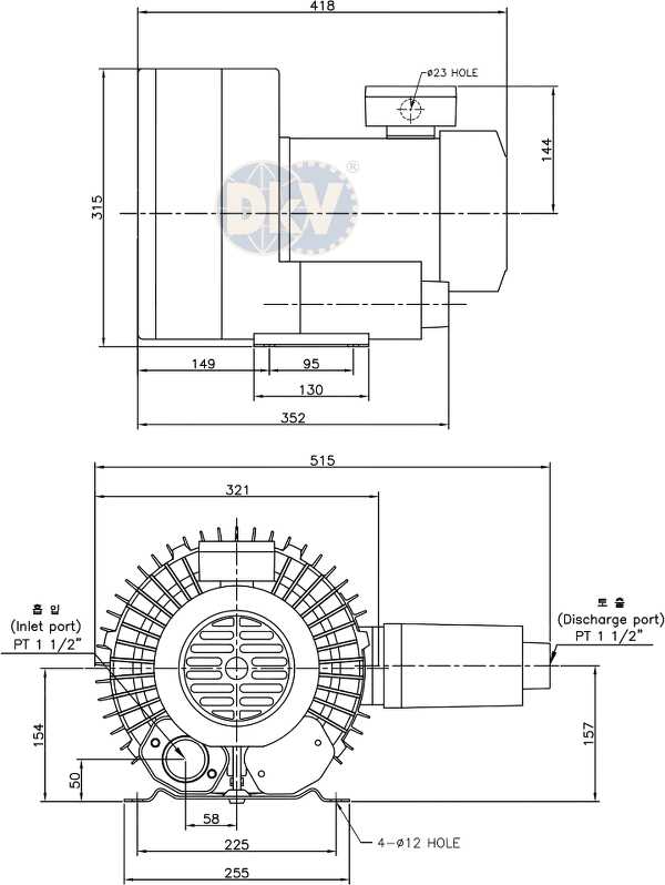 Cổ hút và cổ xả của máy thổi khí con sò Hwanghae HRB-402S/1 đều có ren size tiêu chuẩn PT 1-1/2", thuận tiện khi kết nối với đường ống hoặc các phụ kiện (lọc gió đầu vào, ống giảm thanh, valve chỉnh áp....). Dưới đáy chân đế của máy thổi khí con sò Hwanghae HRB-402S/1 có 4 lỗ khoan Ø 12 mm, thuận tiện khi gá đặt.