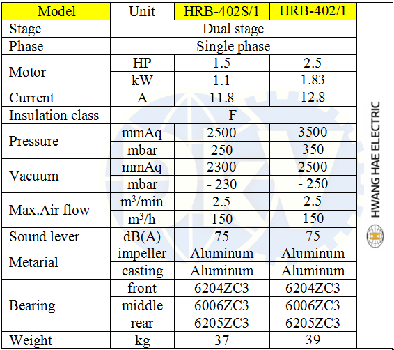 Máy thổi khí con sò Hwanghae HRB-402S/1, Hwanghae ring blower HRB-402S/1, Hwanghae slide channel blower HRB-402S/1: có hình dạng con sò, thuộc loại 2 cấp - dual satge (2 tầng) do Hwanghae | Korea sản xuất. Máy thổi khí con sò Hwanghae HRB-402S/1 có lưu lượng max: 2.5 (m3/phút) | 150 m3/giờ, áp thổi max: 2.500 mmAq (250 mbar) | cột áp 2.5 mét, độ chân không: - 2.300 mmAq (-230 mbar), chuyên dùng để hút/thổi khí trong dân dụng và công nghiệp.