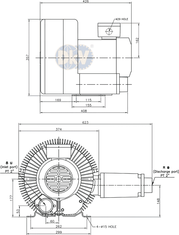 Cổ hút và cổ xả của máy thổi khí con sò Hwanghae HRB-502 đều có ren size tiêu chuẩn PT 2", thuận tiện khi kết nối với đường ống hoặc các phụ kiện (lọc gió đầu vào, ống giảm thanh, valve chỉnh áp....). Dưới đáy chân đế của máy thổi khí con sò Hwanghae HRB-502 có 4 lỗ khoan Ø 15 mm, thuận tiện khi gá đặt.