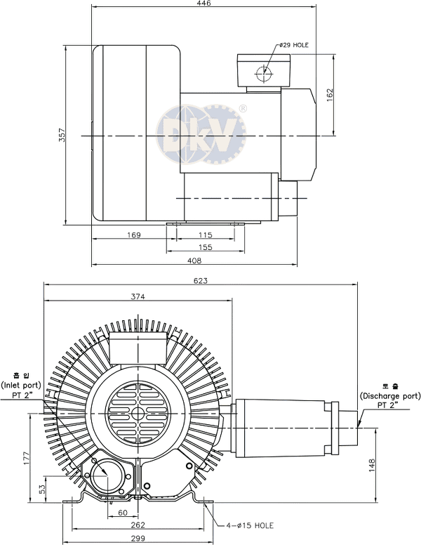 Cổ hút và cổ xả của máy thổi khí con sò Hwanghae HRB-602 đều có ren size tiêu chuẩn PT 2", thuận tiện khi kết nối với đường ống hoặc các phụ kiện (lọc gió đầu vào, ống giảm thanh, valve chỉnh áp....). Dưới đáy chân đế của máy thổi khí con sò Hwanghae HRB-602 có 4 lỗ khoan Ø 15 mm, thuận tiện khi gá đặt.