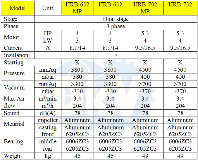 Máy thổi khí Hwanghae HRB-602, sử dụng động cơ 4 HP/220 - 380V/50Hz/3ph, quấn dây đồng 100%, độ ồn max: 78 dB(A), sẽ giảm tiếng ồn khi lắp thêm ống giảm thanh tại cổ xả khí. Phân cánh quạt và thân vỏ được chế tạo bằng nhôm, giúp nhẹ và thoát nhiệt tốt.