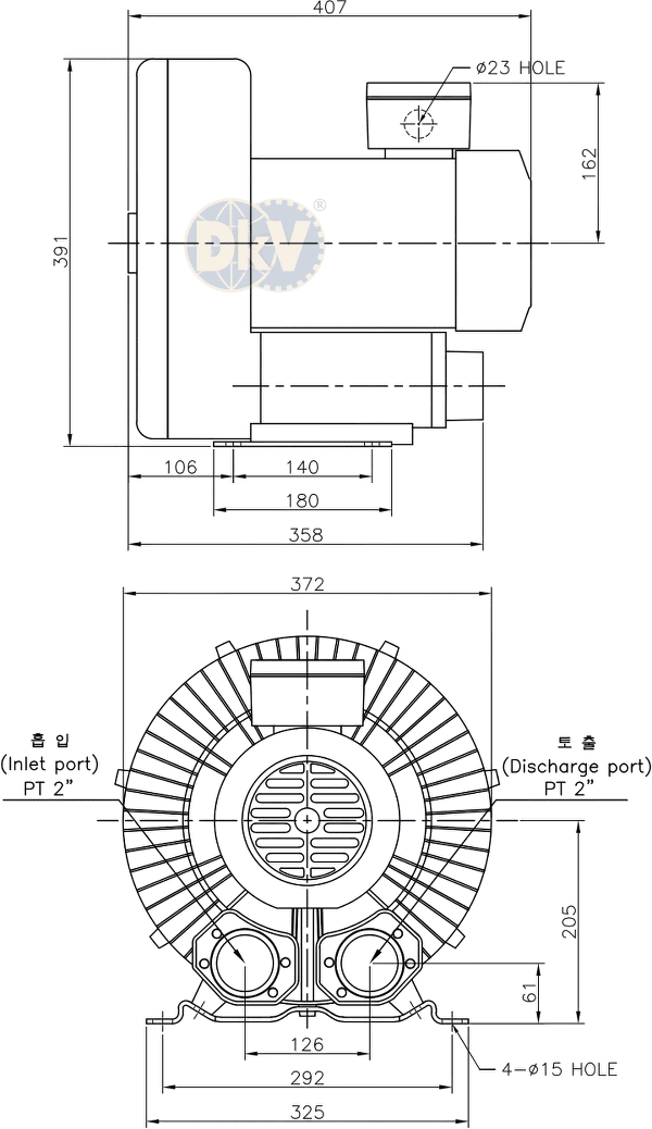 Cổ hút và cổ xả của máy thổi khí con sò Hwanghae HRB-700 đều có ren size tiêu chuẩn PT 2", thuận tiện khi kết nối với đường ống hoặc các phụ kiện (lọc gió đầu vào, ống giảm thanh, valve chỉnh áp....). Dưới đáy chân đế của máy thổi khí con sò Hwanghae HRB-700 có 4 lỗ khoan Ø 15 mm, thuận tiện khi gá đặt.