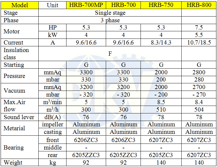 Máy thổi khí con sò Hwanghae HRB-700, sử dụng động cơ 5.3HP/220 - 380V/50Hz/3ph, quấn dây đồng 100%, độ ồn max: 76 dB(A), sẽ giảm tiếng ồn khi lắp thêm ống giảm thanh tại cổ xả khí. Phân cánh quạt và thân vỏ được chế tạo bằng nhôm, giúp nhẹ và thoát nhiệt tốt.