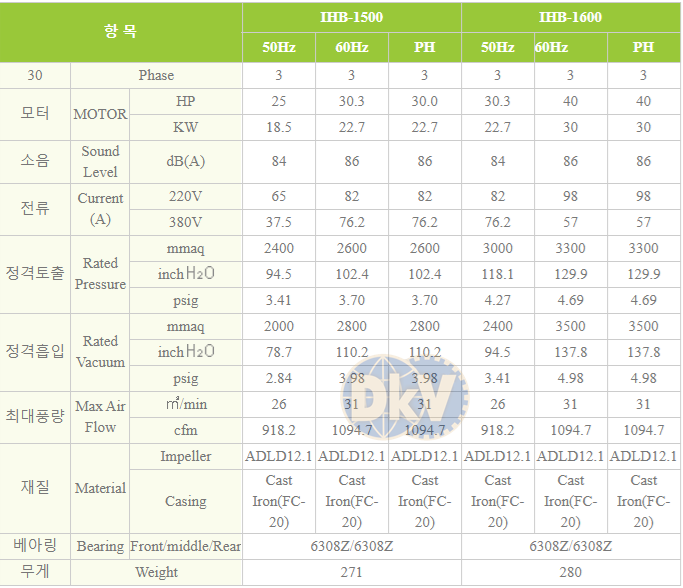 Máy thổi khí con sò Inha IHB-1600, sử dụng động cơ 22,7 kW (30HP)/380V/50Hz/3ph, quấn dây đồng 100%, độ ồn max: 84 dB(A), sẽ giảm tiếng ồn khi lắp thêm ống giảm thanh tại cổ xả khí. Phân cánh quạt và thân vỏ được chế tạo bằng nhôm, giúp nhẹ và thoát nhiệt tốt.