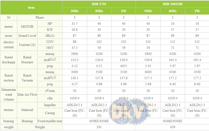 Máy thổi khí con sò Inha IHB-1802OB, sử dụng động cơ 30 kW (40 HP)/380V/50Hz/3ph, quấn dây đồng 100%, độ ồn max: 87 dB(A), sẽ giảm tiếng ồn khi lắp thêm ống giảm thanh tại cổ xả khí. Phân cánh quạt và thân vỏ được chế tạo bằng nhôm, giúp nhẹ và thoát nhiệt tốt.