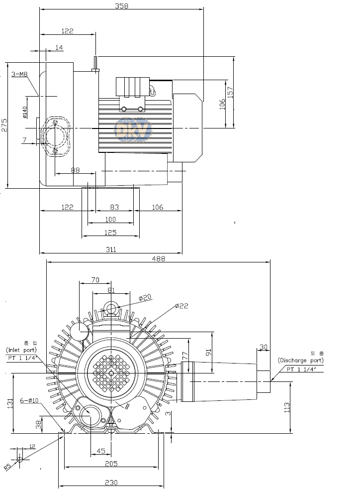 Cổ hút và cổ xả của máy thổi khí con sò Inha IHB-302-1 đều có ren size tiêu chuẩn PT 1-1/4", thuận tiện khi kết nối với đường ống hoặc các phụ kiện (lọc gió đầu vào, ống giảm thanh, valve chỉnh áp....). Dưới đáy chân đế của máy thổi khí con sò Inha IHB-302-1 có 4 lỗ khoan Ø 12 mm, thuận tiện khi gá đặt.