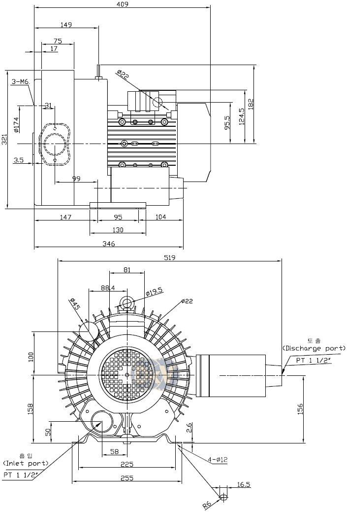 Cổ hút và cổ xả của máy thổi khí con sò Inha IHB-402S-1 đều có ren size tiêu chuẩn PT 1-1/2", thuận tiện khi kết nối với đường ống hoặc các phụ kiện (lọc gió đầu vào, ống giảm thanh, valve chỉnh áp....). Dưới đáy chân đế của máy thổi khí con sò Inha IHB-402S-1 có 4 lỗ khoan Ø 12 mm, thuận tiện khi gá đặt.